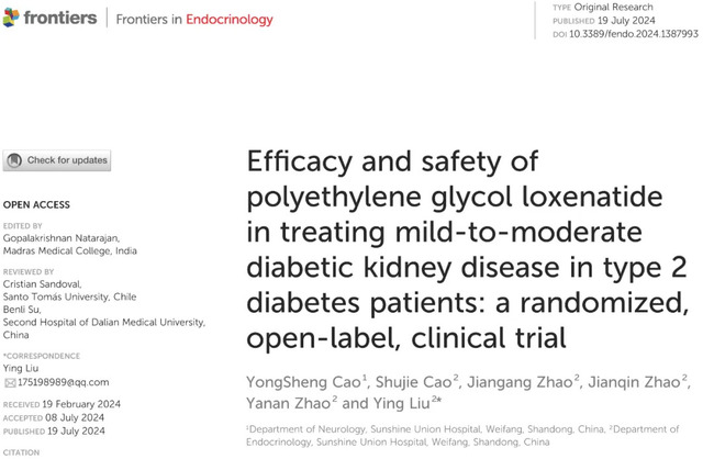 (1) Cao Y, Cao S, Zhao J, Zhao J, Zhao Y and Liu Y (2024) Efficacy and safety of polyethylene glycol loxenatide in treating mild-to-moderate diabetic kidney disease in type 2 diabetes patients: a randomized, open-label, clinical trial.Front Endocrinol. 15:1387993.