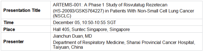Hansoh Pharmaceutical Group Co., Ltd. (Hansoh Pharma, 03692.HK) today announced that the encouraging phase I study results of risvutatug rezetecan (HS-20093/GSK5764227, a B7-H3-targeted antibody-drug conjugate [ADC]), in patients with locally-advanced or metastatic Non-Small Cell Lung Cancer (NSCLC), were presented in a mini oral session at ESMO Asia 2025 (December 05-07, Singapore) on December 05 (SGT).