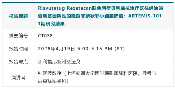 Risvutatug rezetecan是一款靶向B7-H3的抗体偶联药物 (ADC),目前正针对多种实体瘤开展临床研究。阿得贝利单抗是一种全人源抗PD-L1 IgG4 单克隆抗体,已在中国获批用于广泛期小细胞肺癌的一线治疗。本次在AACR 2026年会上,以口头报告形式公布的数据来自于ARTEMIS-101研究的一个扩展队列——评估Risvutatug rezetecan联合阿得贝利单抗用于既往经治的驱动基因(AGAs)阴性的非鳞非小细胞肺癌(nsq-NSCLC)患者。
