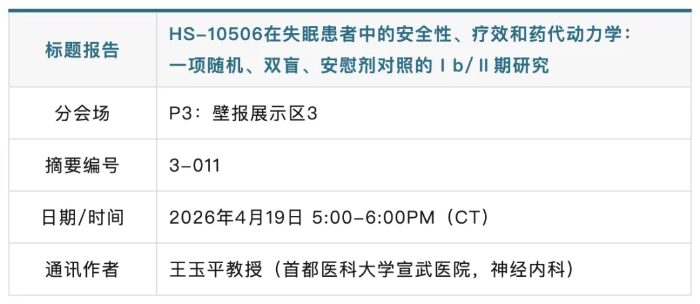 AAN 2026 | 翰森制药OX2R拮抗剂HS-10506用于失眠患者治疗的Ⅰb/Ⅱ期研究数据发布
